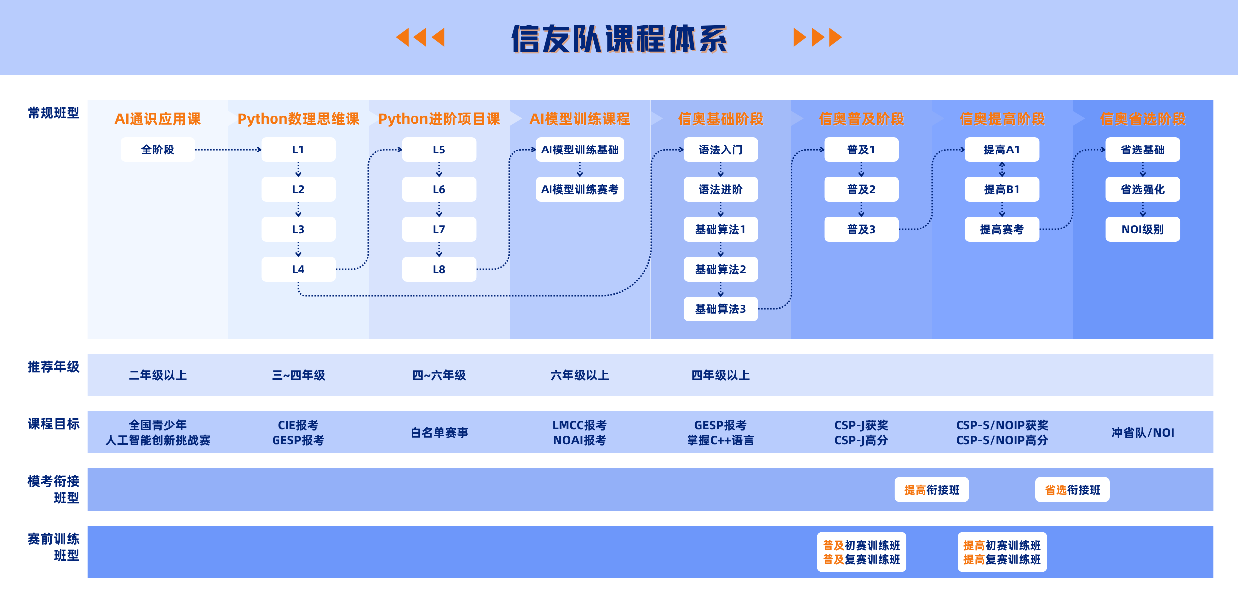 信友队常规课程体系是一个为学员提供全面的编程教育的学习计划。无论你是否具有编程基础,我们都欢迎你加入我们的课程。如果你对我们的课程感兴趣,欢迎联系我们进行咨询。我们将很高兴为你解答任何问题,并帮助你规划适合你的学习计划。无论你是初学者还是有一定编程基础,我们都有适合你的课程和学习资源。期待与你共同探索编程的世界!